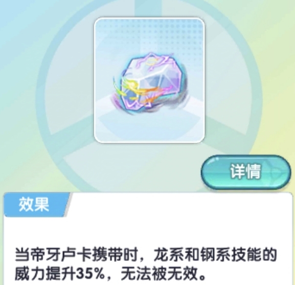 帝牙卢卡携带时,血量、特攻增加30%,每次选择【支配】状态后,获得1回合失控状态,失控现在时候受到伤害降低20%,自身特攻能力等级+1,失控过去时候受到伤害降低25%,造成伤害增加25%,技能必中,失控未来时基础速度增加25%,造成伤害增加25%,技能必中无法被无效,无法被无效也不怕落拳