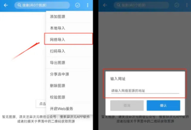 3、然后点击右上角的三个点,选择“网络导入”,然后输入图源网址