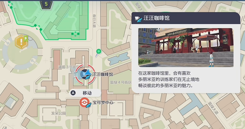 5、要想让利欧路进化成路卡利欧,可以去喝咖啡,我们在游戏地图中找一下咖啡店