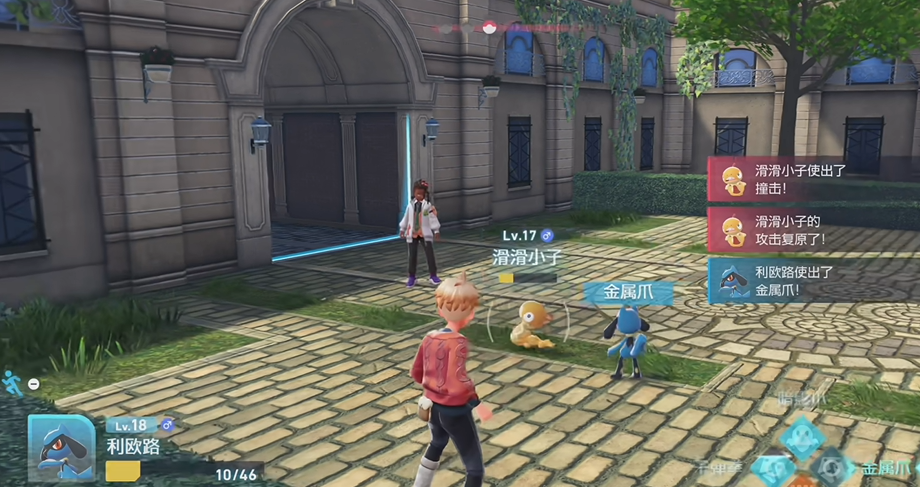4、上来后就能遇到利欧路,我们新手任务做完等级就不会差它太多。利欧路整体伤害不高但比较难捉,建议给它上一些异常的属性buff,同时尽量多带一些精灵球(大概消耗10个精灵球左右)