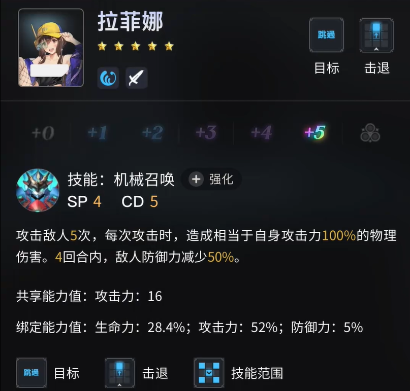 1、代号A拉菲娜服装技能为攻击跳过X范围的敌人5次,并减少敌人50%物防4回合。一般吃不到游戏社的脆弱,因此伤害占比较低,主要用途是给主C叠5连击增伤。
