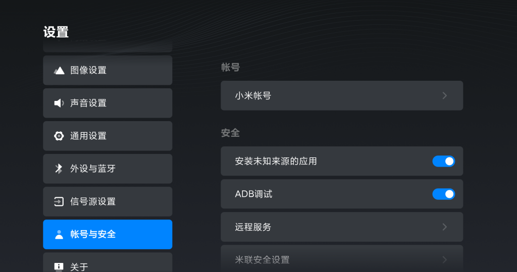 2、在设备(电视、手机、平板)打开“开发者选项”、“Adb无线调试”。如图所示,如果是电视的话,请打开这两个选项。