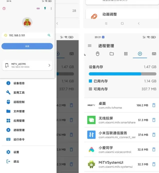 4、连接成功后,可以轻松获取电视的各种设备信息,包括进程服务、应用管理等。