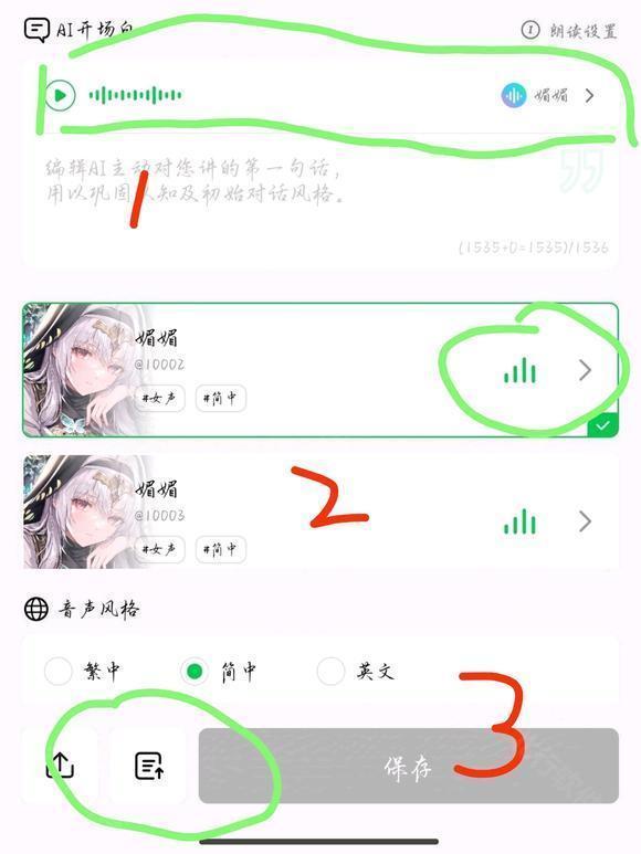 1、首先点开你想上传音声的AI头像,下滑到开场白。在这里可以设置音声风格,点击保存旁边的上传按钮可以上传音声