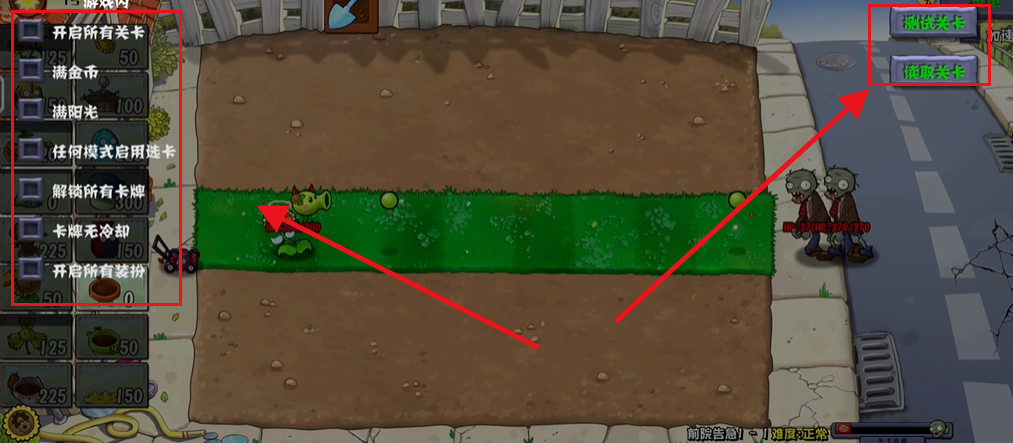 3、点击【僵尸进度条】可以看到游戏暂停了,并且左右两边出现了GM修改项目,可以随意开启自己想使用的功能
