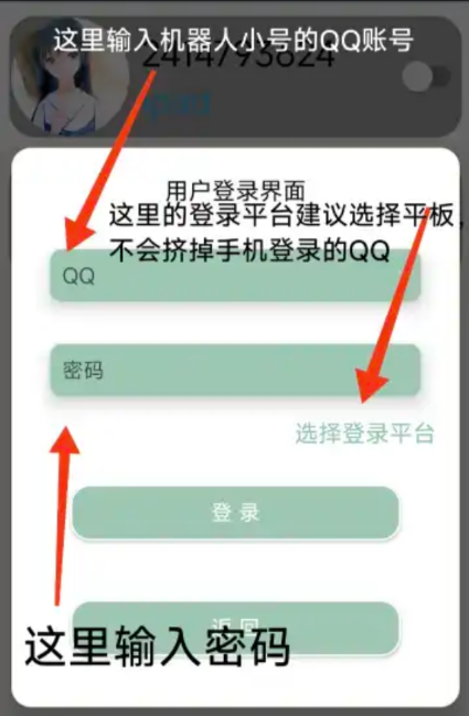 2、首先我们打开软件登录自己的QQ机器人账号,建议选择平板登录,不会挤掉手机登录的QQ