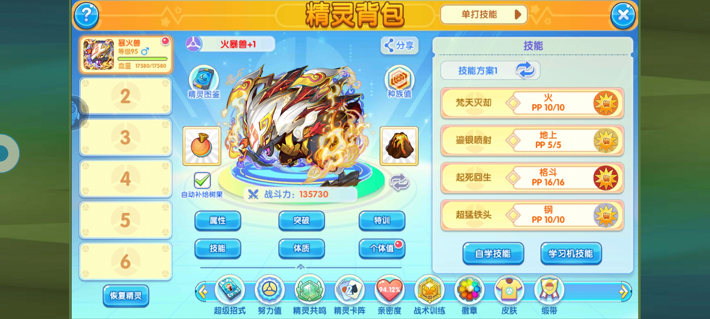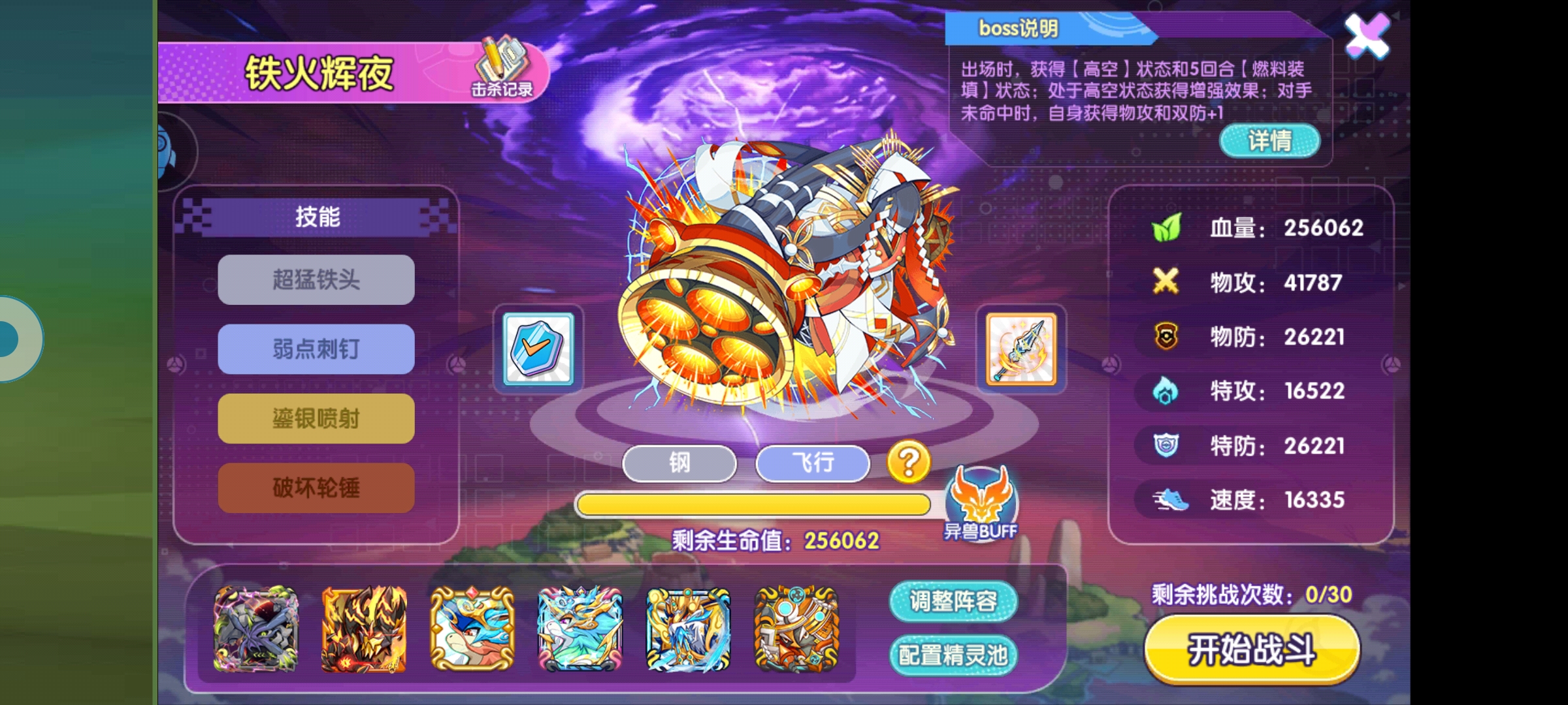 1、无尽空袭,效果出场时,获得【高空】状态和5回合【燃料装填】状态;处于高空状态获得增强效果;对手未命中时,自身获得物攻和双防+1,处于【高空】状态下,使用攻击技能时,附加一段30倍自身体重除以对手体重威力的钢属性物攻技能,无最大威力上限,高空效果:除岩石系,电系,冰系攻击技能外,任何来自对方的技能均无法影响处于高空状态的精灵,燃料装填效果:出场时,无法再进入高空状态,受到伤害降低15%。
