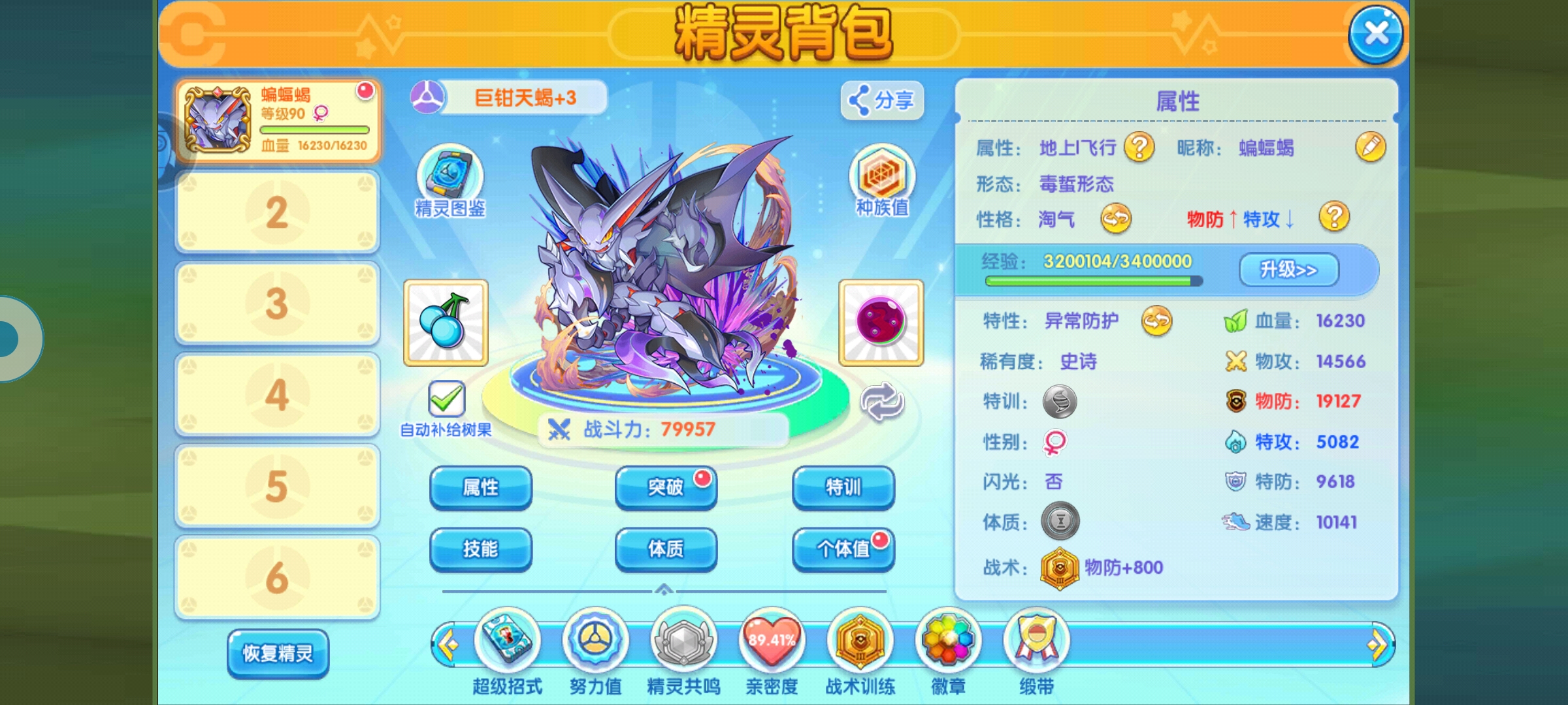1、它的特性是超·肌肉爆冲。效果是自身或对手出场时,根据双方物攻种族值差值改变【超·肌肉膨胀】状态层数;使用技能时,根据双方技能威力差值获得增强或减弱效果。首先获得10层【超·肌肉膨胀】状态,自身物攻种族值每高对手1点获得1层【超·肌肉膨胀】状态;种族值根据精灵的实时数值判断。使用技能面板威力>对手时,每高一点伤害提升2%,吸收效果提升2%;无上限限制,使用技能面板威力<对手时,每低一点伤害降低2%;无上限限制,该特性不会被特性和技能无视、改变、复制。