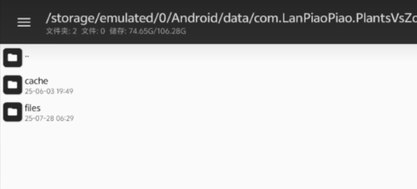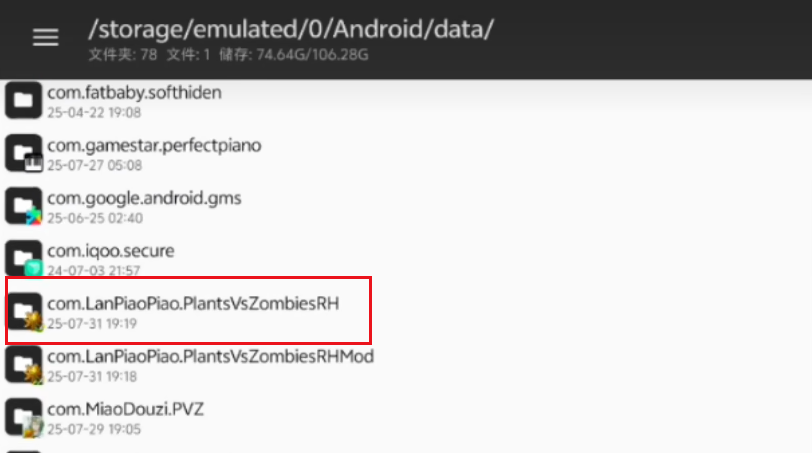 2、在data文件夹中找到com.LanPiaoPiao.PlantsVsZombiesRH,这个是融合版的游戏文件。如果应用太多,找起来麻烦可以点击右上角三个点搜索按钮,搜索大写的RH