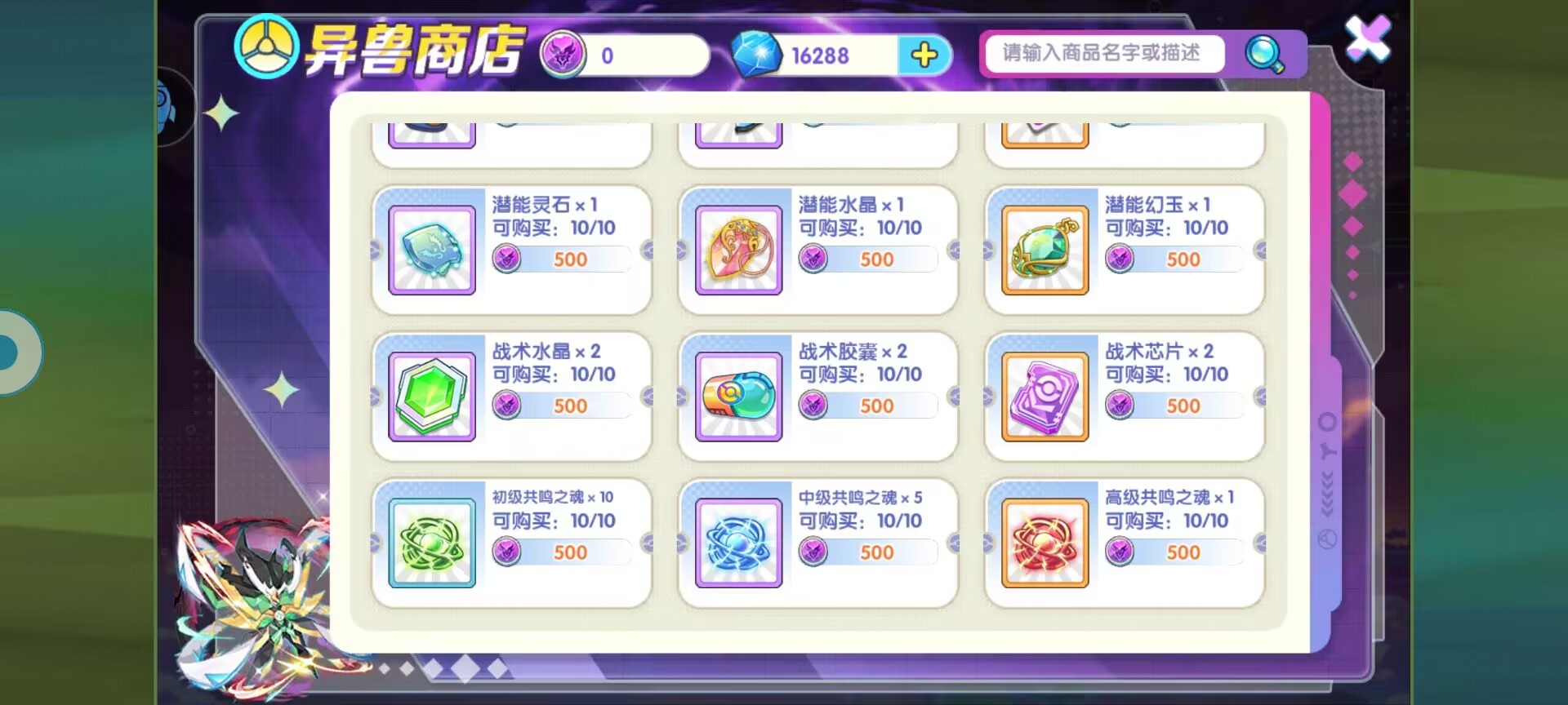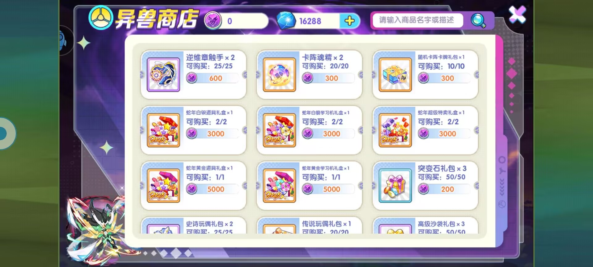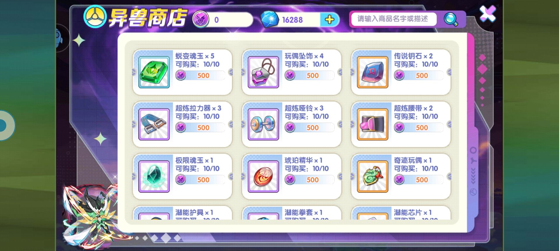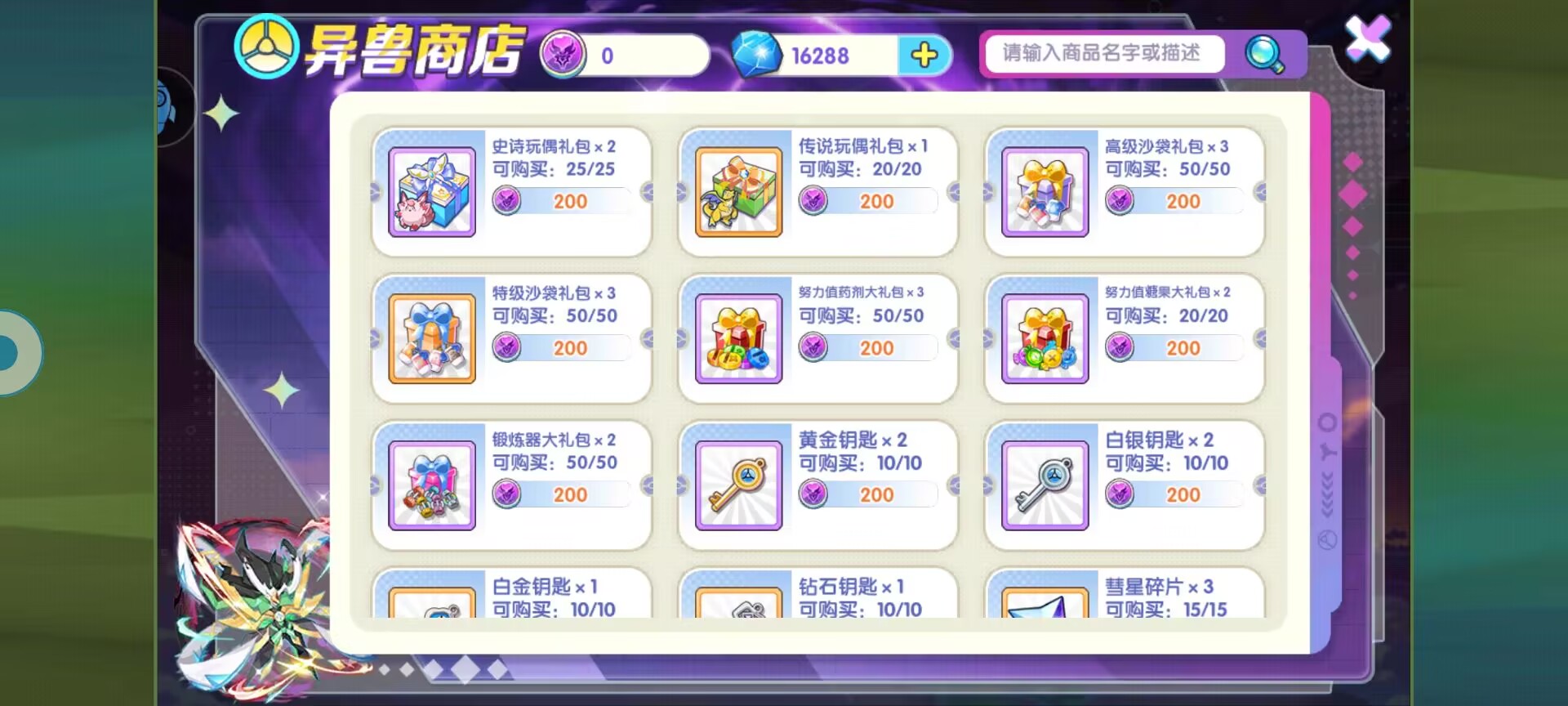 首先就是这次异兽商店主要是资源,还有部分道具。这一栏的很多沙袋、玩偶礼包是给没m前的准备的,所以就先不推荐了,最后多余的零散积分处理不了可以换黄金钥匙。