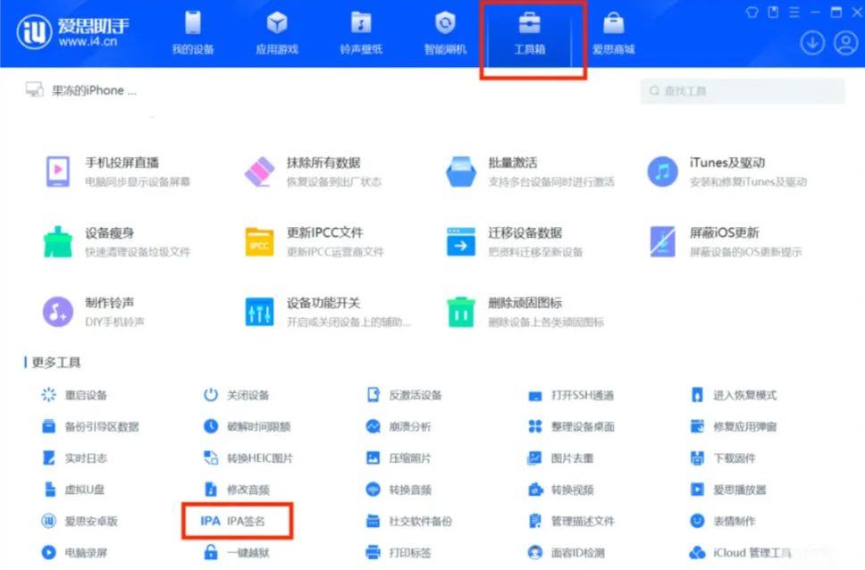2、在电脑上安装“爱思助手”,将你的手机和电脑连接,打开爱思助手→工具箱→IPA签名。