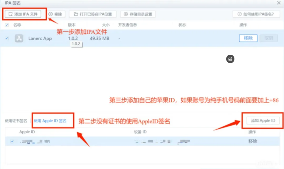 4、接下来添加签名的苹果ID,ID分为邮箱和手机号码两种,如果你的是手机号的ID,登录时前面一定要加入地区号码,例如+8612345678910。