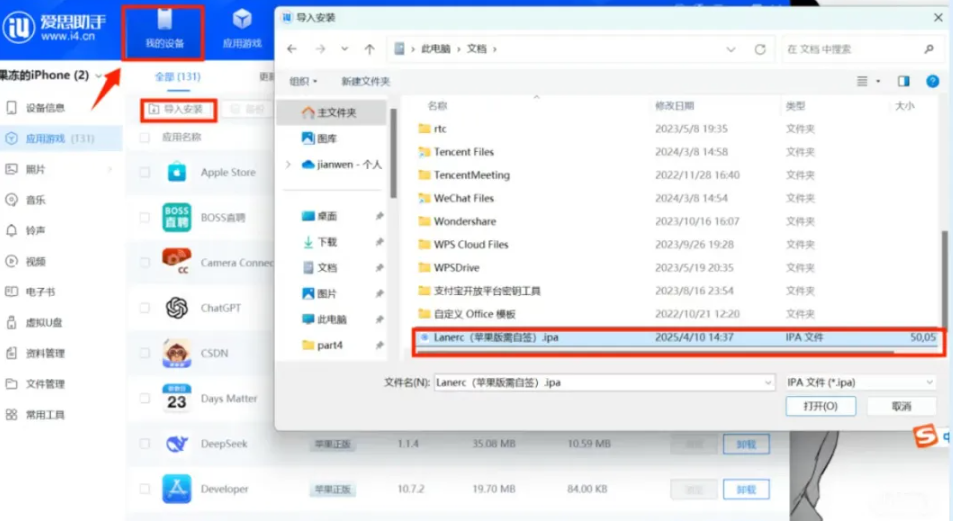 5、步骤顺利即可得到一个签名成功的安装包,然后在爱思助手中依次打开我的设备→导入安装→选择签名成功的安装包,将其安装到手机中。