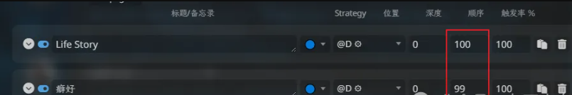 再使用相同 Strategy 和相同 深度 时,这两条是怎么排序的呢?因为 order 相同,按照时间排序。癖好 先创建的,Life Story 是后面创建,所以顺序如下: