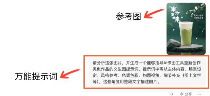 2、豆包会分析图片后给出用于图生图的提示词,拿到提示词后可以自行替换关键元素,以定制自己的内容
