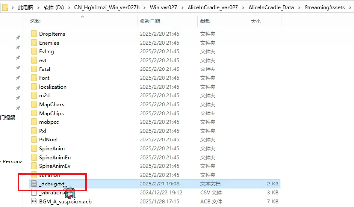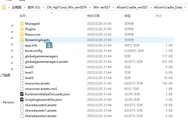 2、依次打开文件AliceInCradle_ver027>AliceInCradle_Data>StreamingAssets