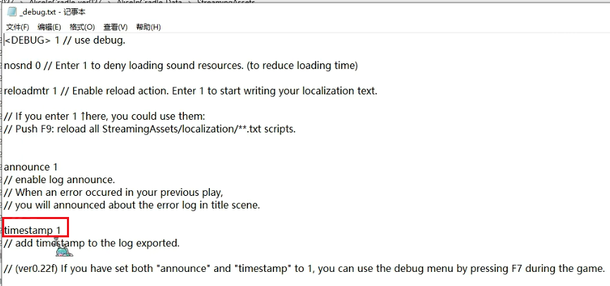 3、在此文件夹中找到_debug.txt文件,用记事本打开,将其中的timestamp后面的0改成1