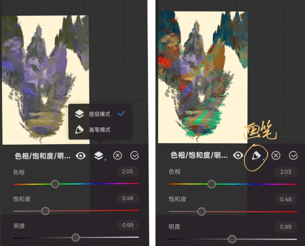 你选图层模式就是调整整个图层,画笔模式就是任意调整(diy)