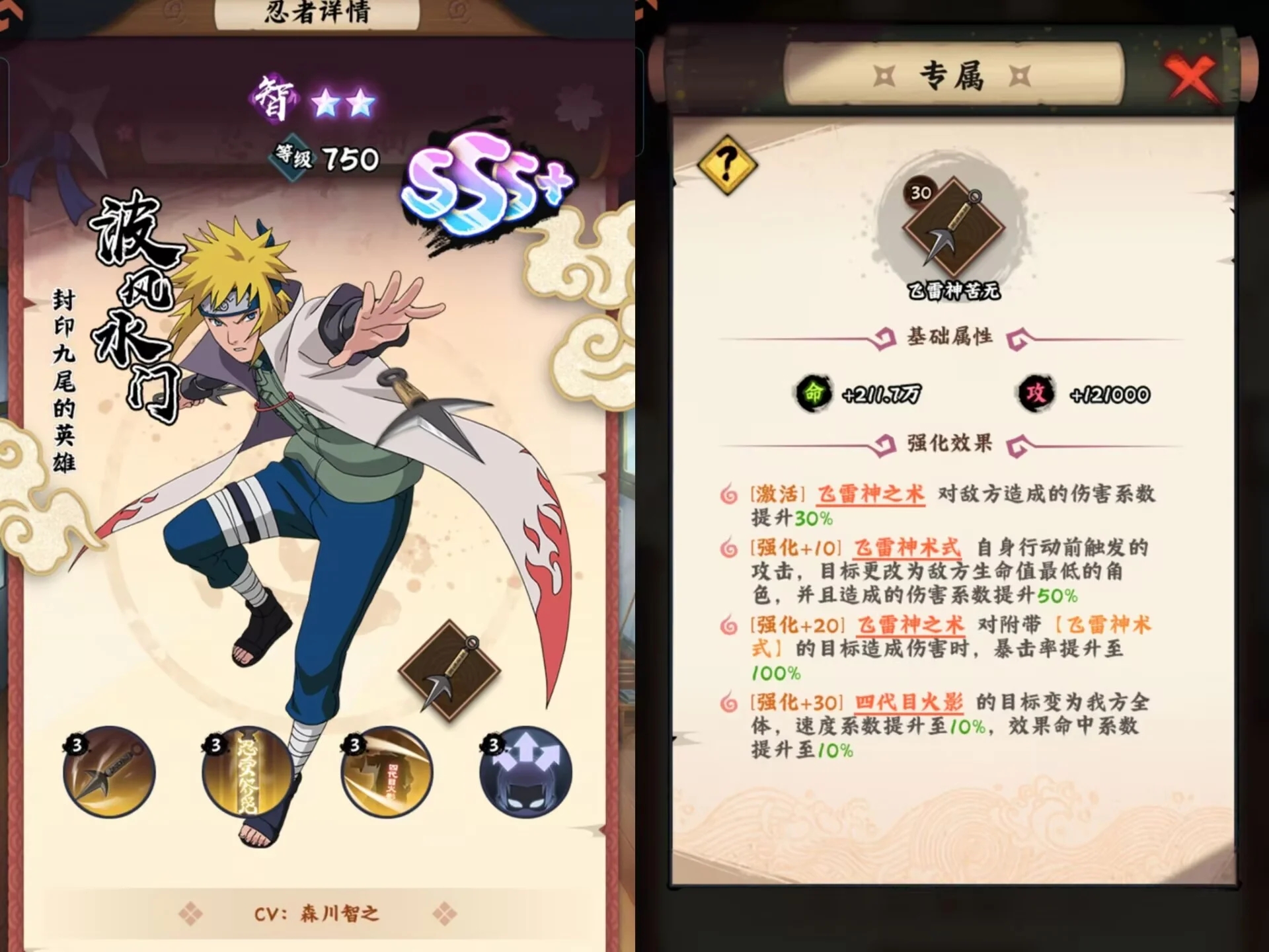 专属+10是玩飞雷神体系的基础,因为开局就可以给生命最低的敌人挂上飞雷神标记,配合二代火影优先锁定残血目标斩杀敌人,形成基础的飞雷神体系。专属+30级是速杀体系的必定要的加速度