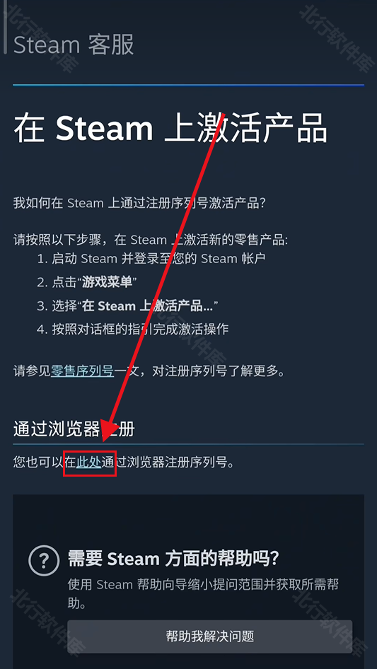 5、这里介绍了cdkey激活方法,但是是PC版的,我们直接看到下方的“您也可以在此处通过浏览器注册序列号”,直接点击“此处”