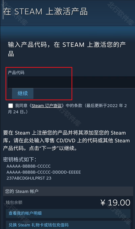 6、来到cdkey激活页面,在产品代码中输入你的cdkey,勾选同意steam用户协议,点击“继续”即可激活