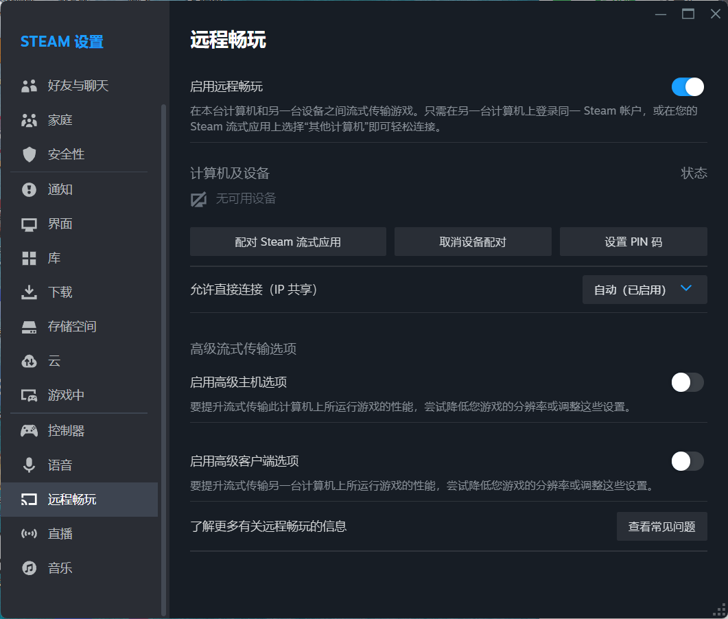 1、首先 PC 端开启 Steam 客户端并在设置中打开“远程畅玩”功能