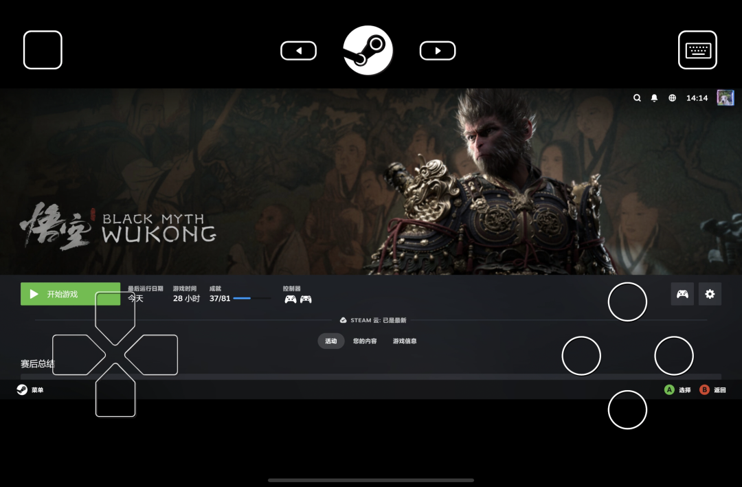 3、在手机上点击“开始运行”,Steam 自动进入大屏模式,手机屏幕上会有虚拟手柄,点击你想玩的游戏,就可以躺在床上畅玩了