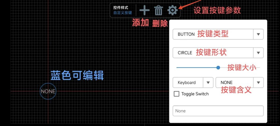 4、添加按键,按键会添加在十字准线所在的位置,可以自行调节按键类型、映射、大小、形状等