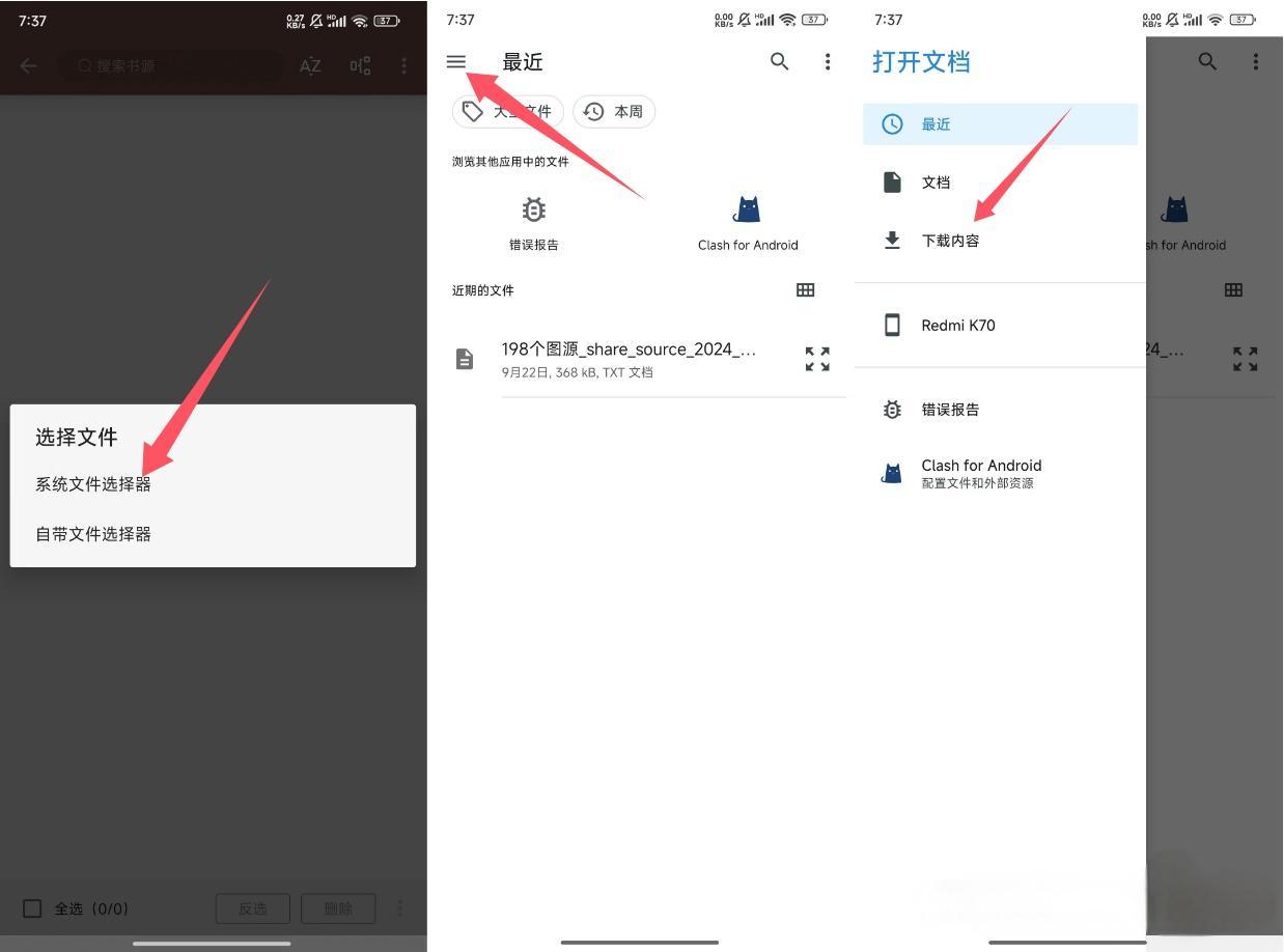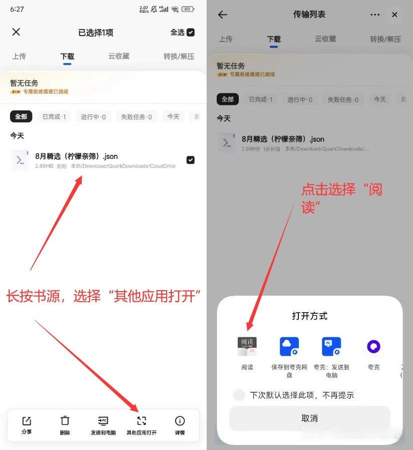 1、把书源文件下载至手机本地后,长按它,然后选择“其他应用打开”,再唤出的“打开方式”里,选择“阅读”
