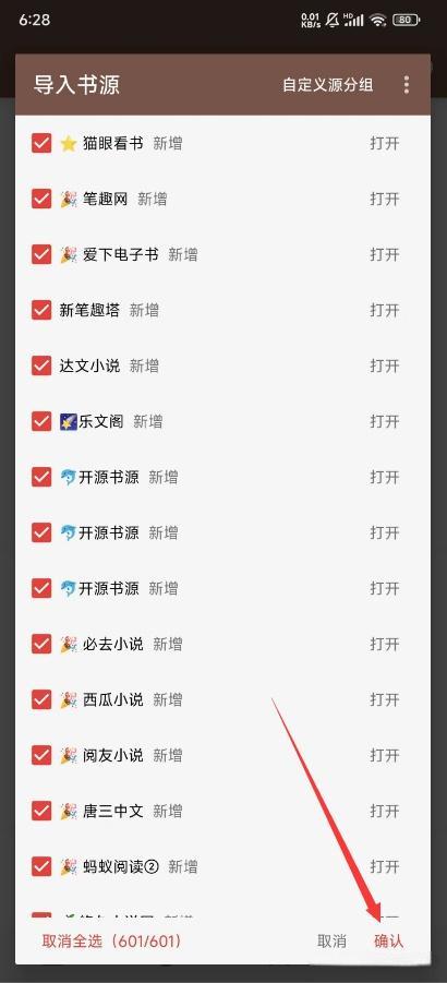 2、打开阅读,随后点击“确定”。这时书源一般就导进去了