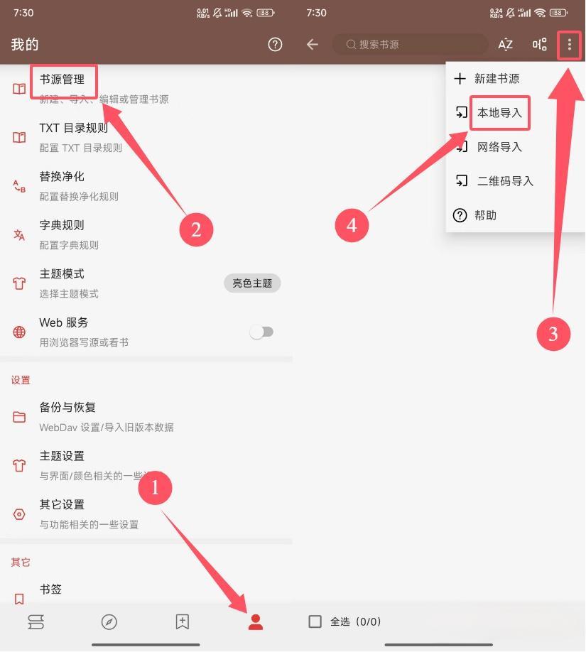 4、打开 阅读App - 我的 - 书源管理 - 右上角菜单