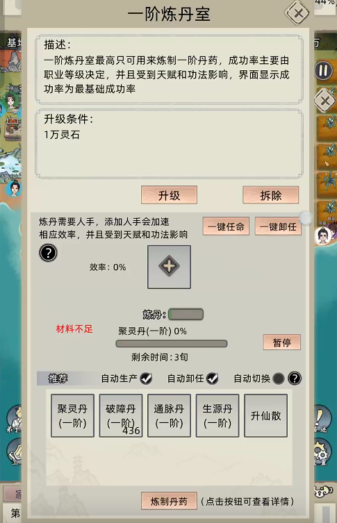 炼丹的前提是有材料,然后需要勾选安排工作炼丹,弟子在有材料的情况下,他就会自己去炼丹。中间我们选择自动卸任,没有材料的时候,他就会不炼丹,都会离开。等有材料的时候,他又回来炼丹,提高炼丹经验等级。