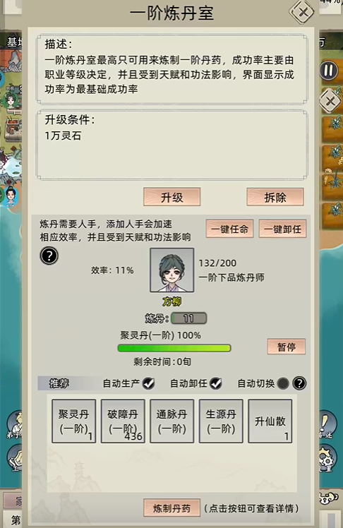修仙家族模拟器中炼丹和炼丹等级非常重要, 平时我们都需要手动操作弟子去炼丹并提升炼丹等级。但理论上只要制作六个炼丹房,从一到六阶,只选择需要突破的炼丹药方,让它去炼丹和突破就能让弟子自己炼丹。下面结合理论为大家提供一个可以让弟子自己炼丹的方法。