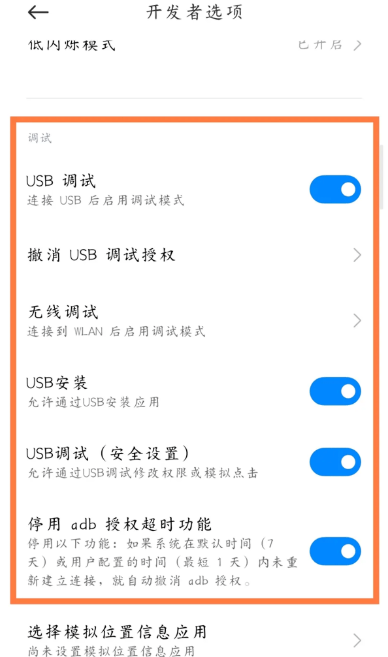 4、返回主页面,点击更多设置-开发者选项-把USB调试、USB安装、USB调试(安全设置)、停用adb授权超时功能
