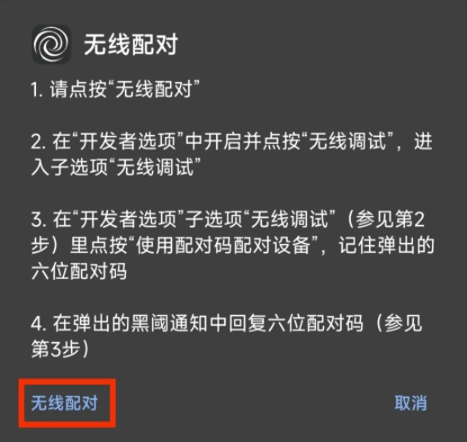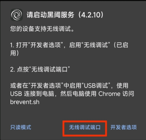 6、然后我们打开黑阈,会有一个弹窗点击-无线调试端口-无线配对
