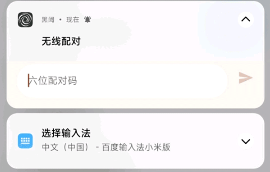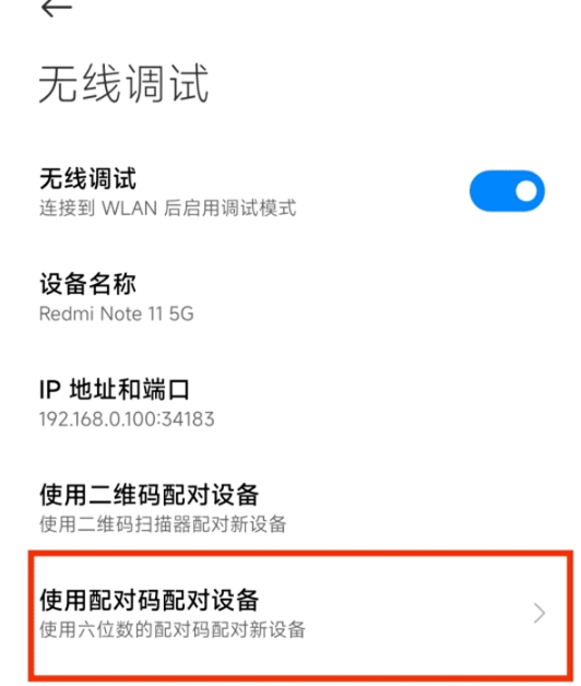 7、之后我们将会回到开发者选项-点击无线调试-使用配对码配对设备-会有6位配对码,接着我们下拉通知栏,会看到黑阈的通知,把配对码输入进去即可配对完成