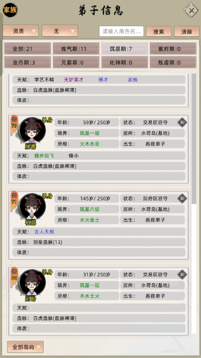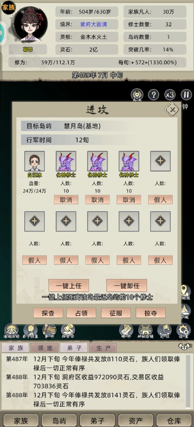 这个方法要用到上面的数字人化神方法,开局的时候选一个最底六阶的岛屿势力,放上我们的一个弟子,派遣我们的化神数字人,去攻打这个岛屿,打赢的一瞬间,点击暂停,点击岛屿选择分家,再点击岛屿点击查看,点击上交弟子,就会有大概率的看见一个高资质的元婴弟子