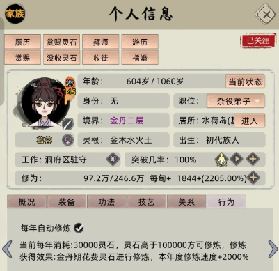 现在只要你有灵石修炼速度根本不是问题,点开人物,点击行为,然后给灵石就好了,修炼非常快。所以开局才要先解决灵石问题