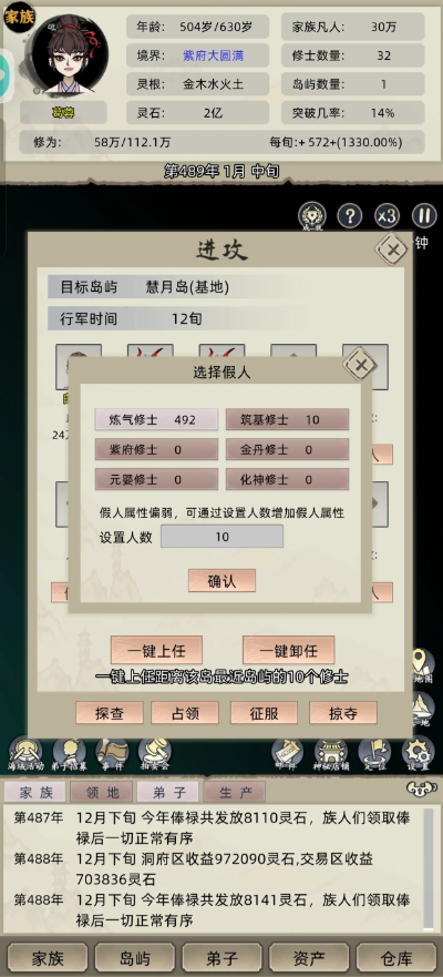 攻打岛屿的时候,自己随便上个弟子,点击派遣数字人,然后点击筑基,设置人数十个,再点击化神,点击确定,就拥有了强大的化神修士帮你打工