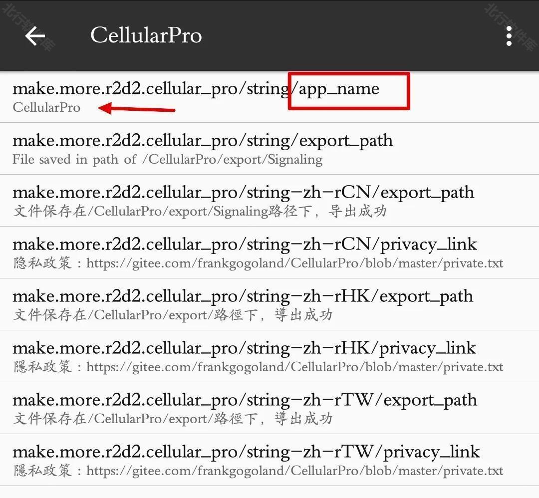 9、可以发现第一行有个APP_nam,这就是软件名的意思。刚好下面就有我们刚才复制的软件名Cellularpro点击查看