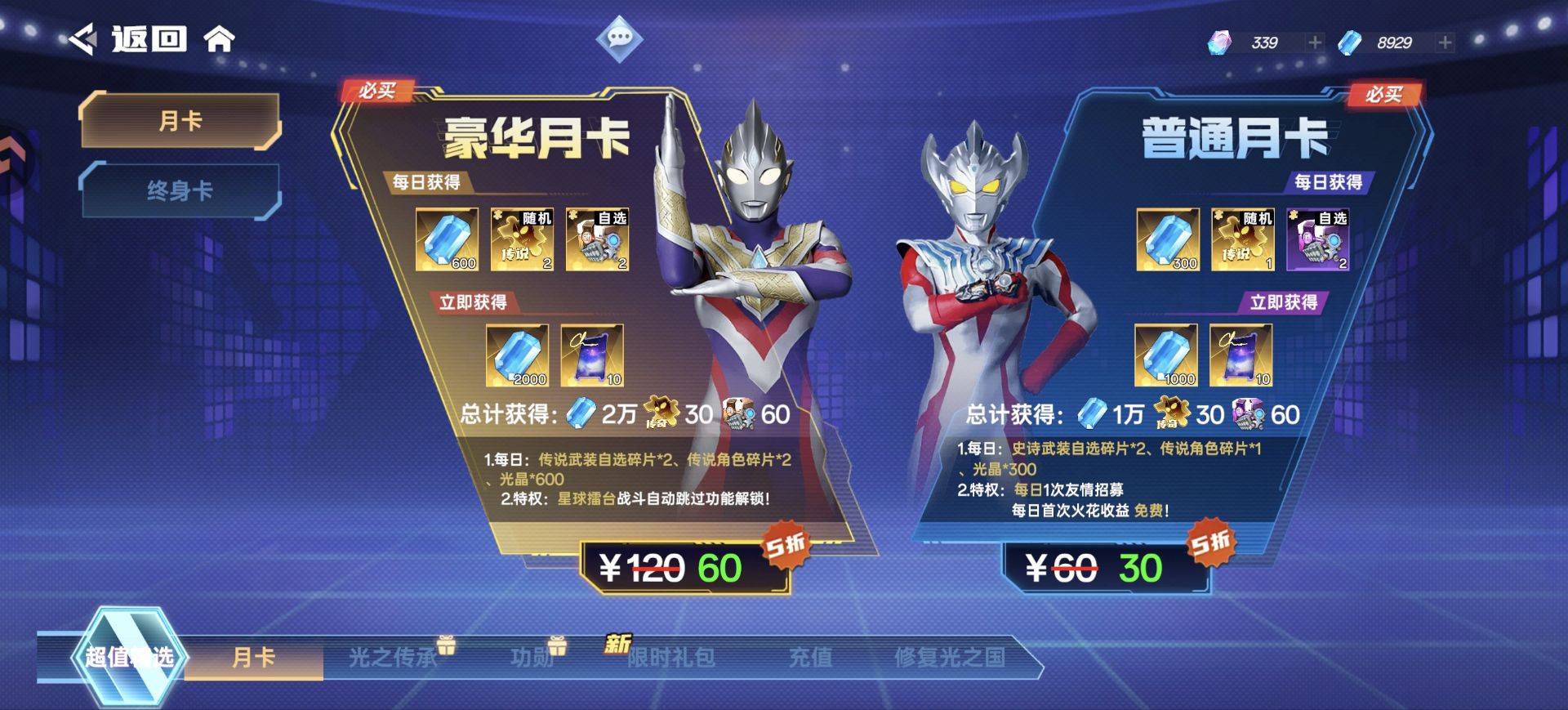 ②小月卡:每个月可以累计获得1万光元+30个随机传说碎片+60个史诗武装自选。买了月卡以后武装的成型速度也会比较快。前期月卡还是非常划算的!后期看自己的需求去买。