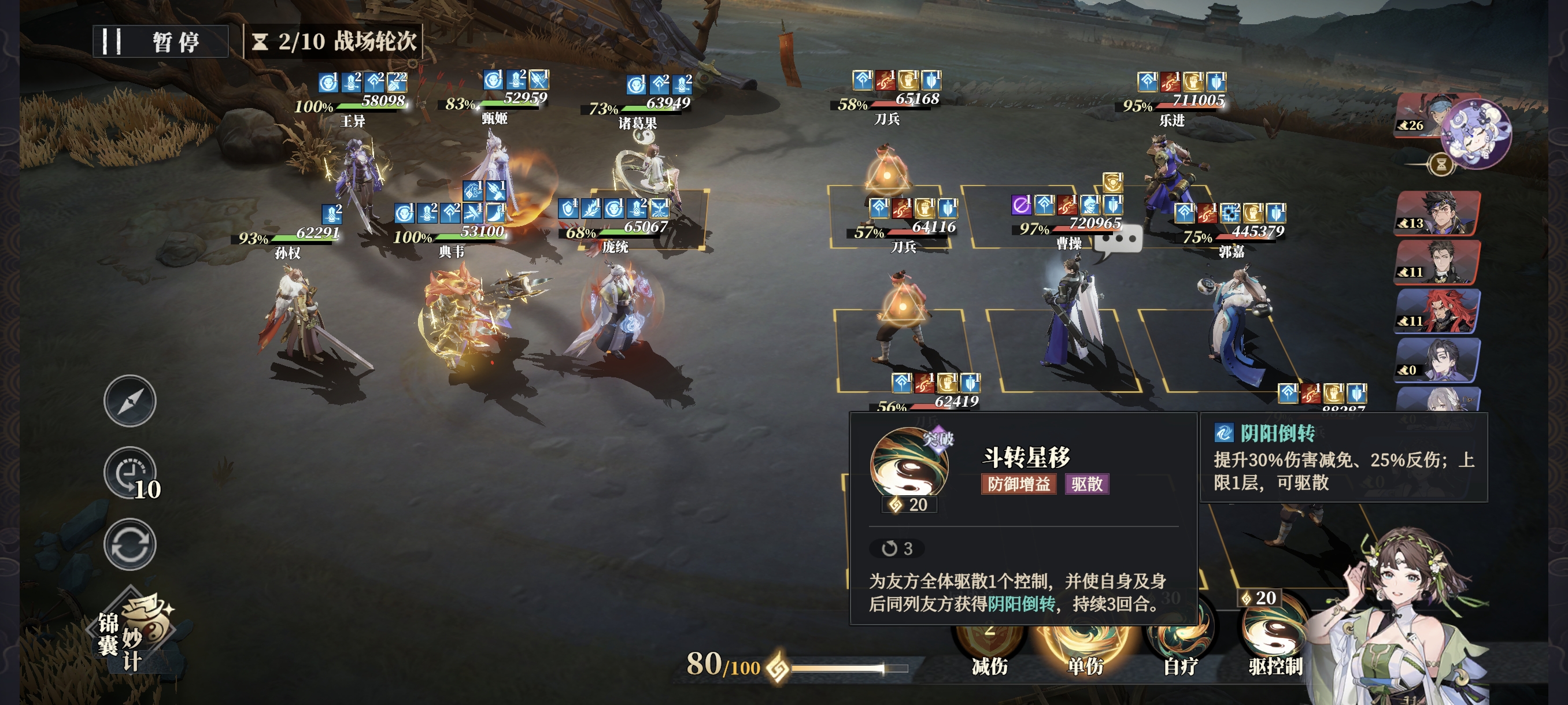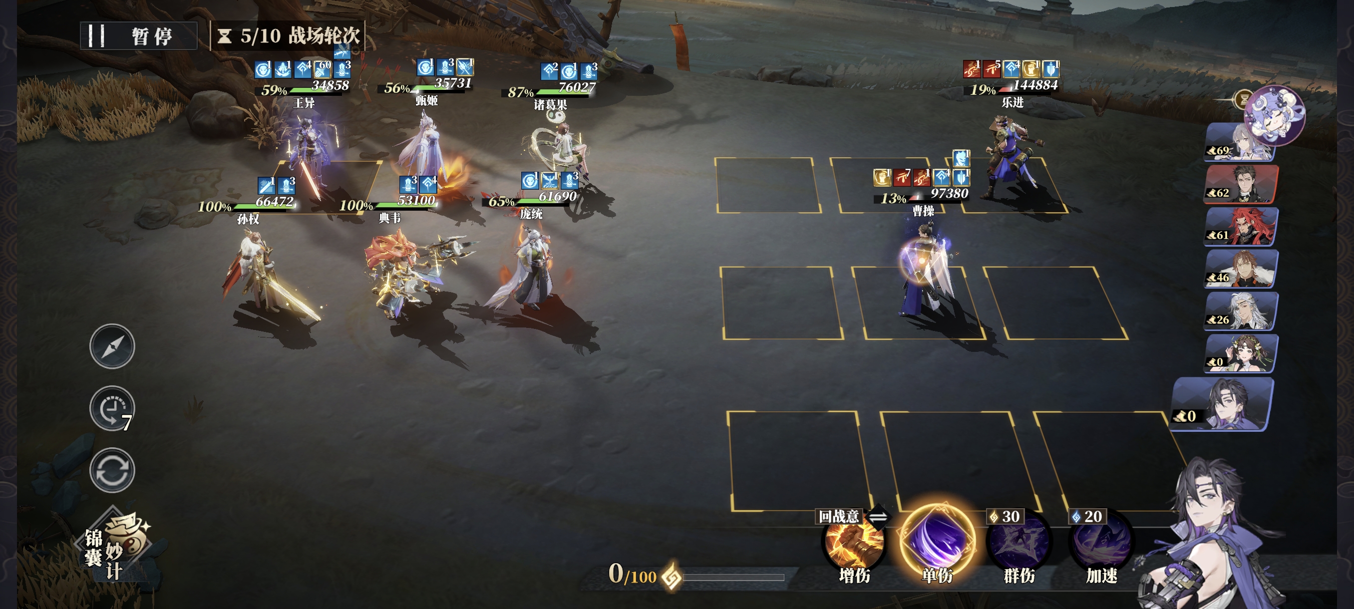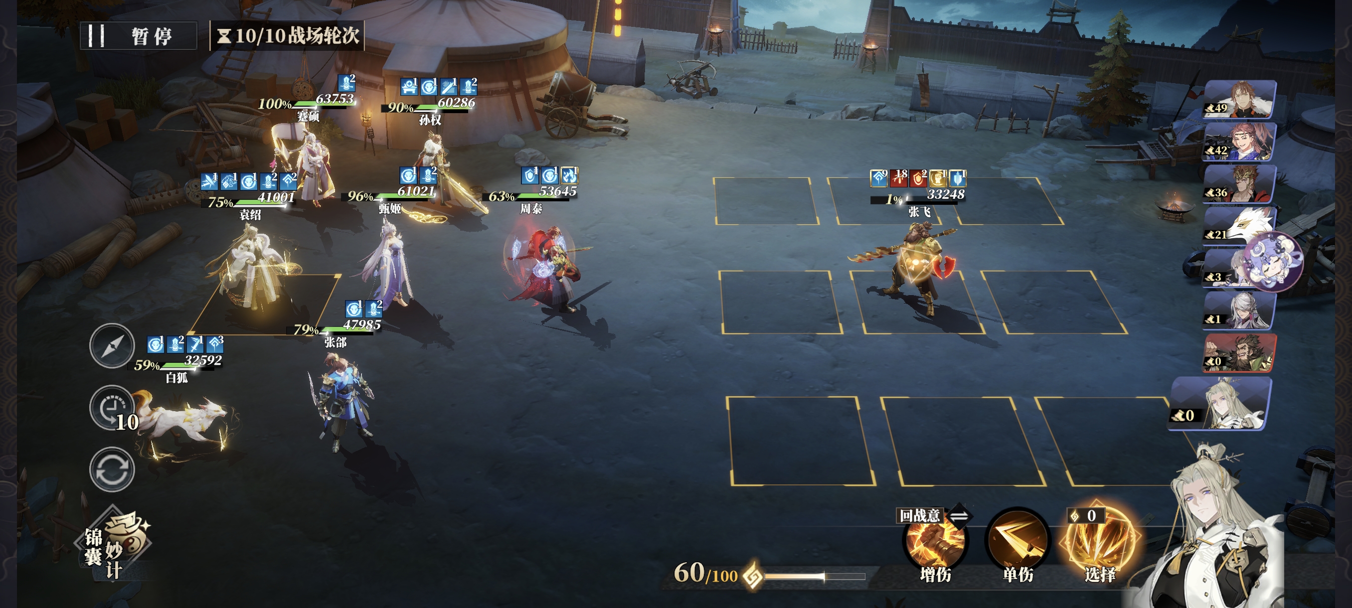 6、狐狸只有在大招0消耗时才放,平时全程普攻。唯一的主输出点就是袁绍,除第1回合战意紧张放一次无消耗的大招外,后续全程输出大招