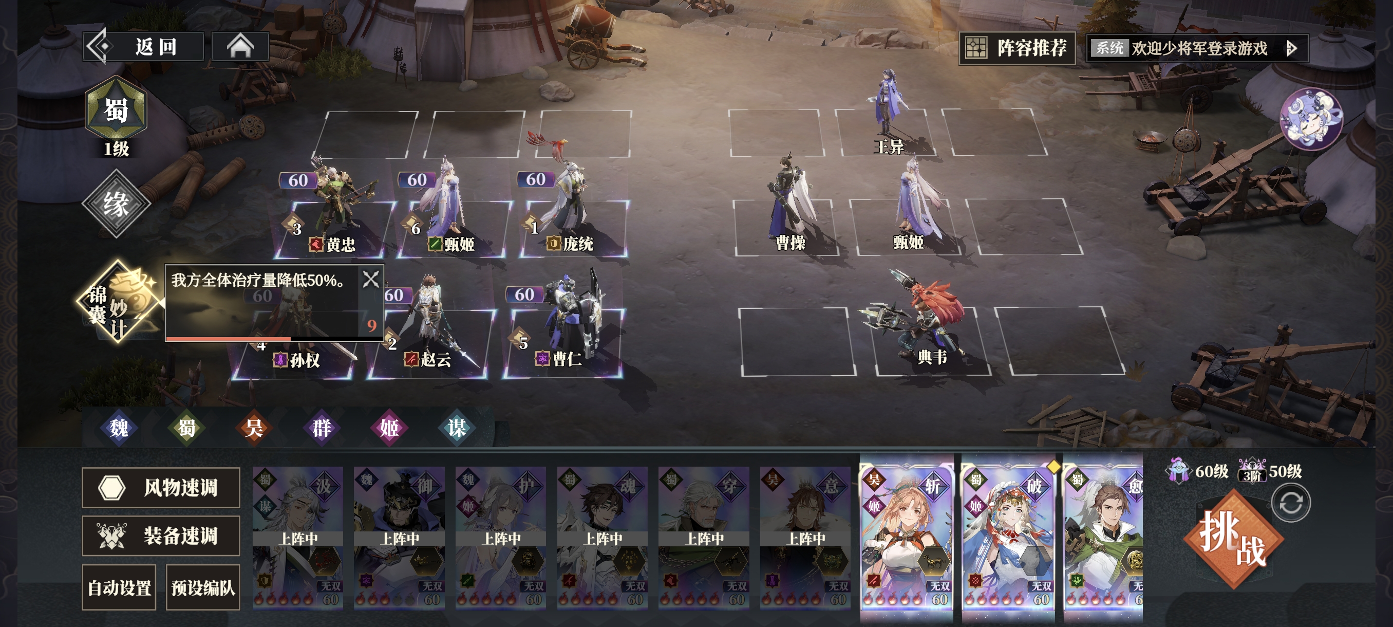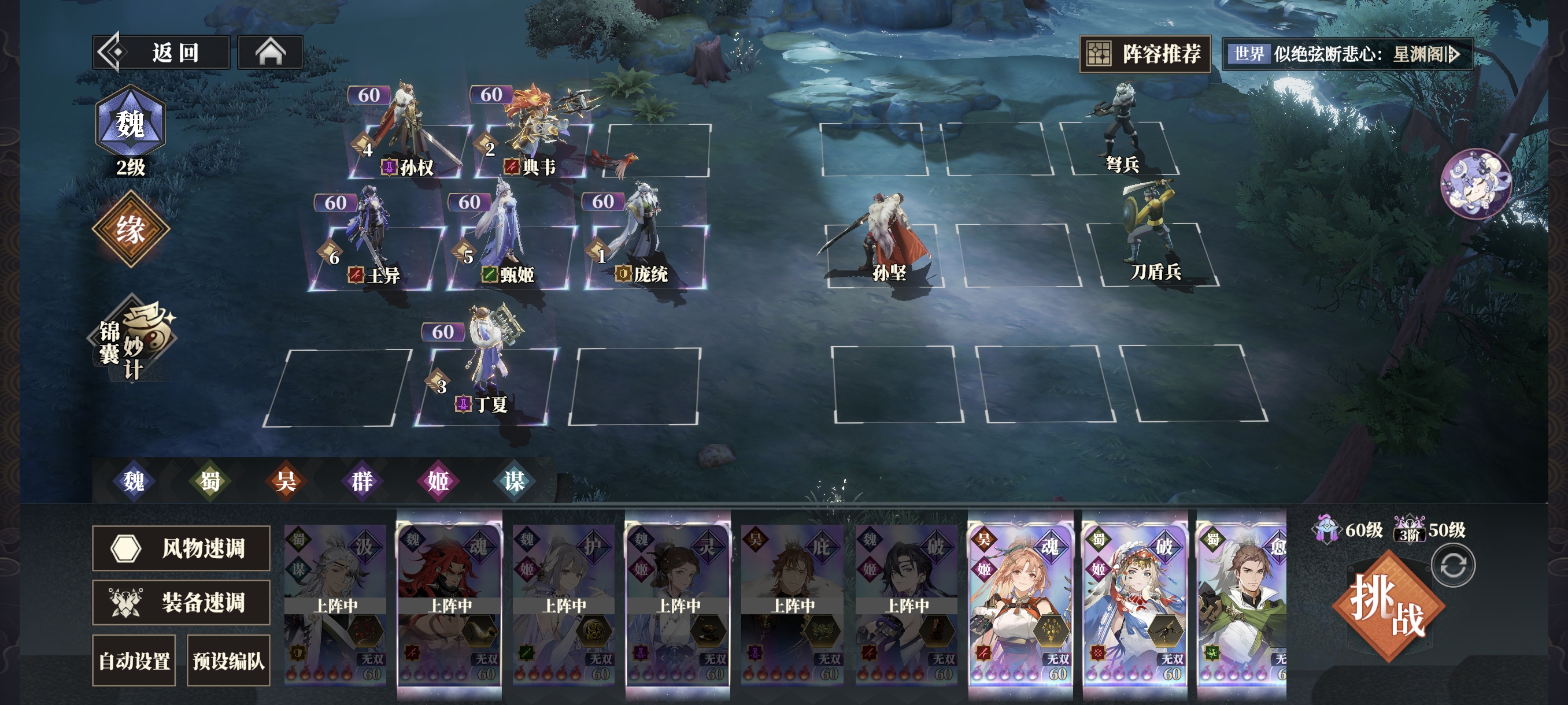 1、本关魏国三人带一堆杂兵的配置,群战肯定是首推王异,本关的主要难点就是别让郭嘉的被动层数叠起来秒人