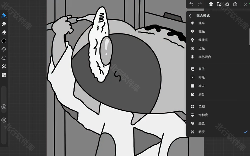 3、在混合模式栏目中往下拉,选择【明度】然后退出,可以看到此时图片已经变成了黑白配色