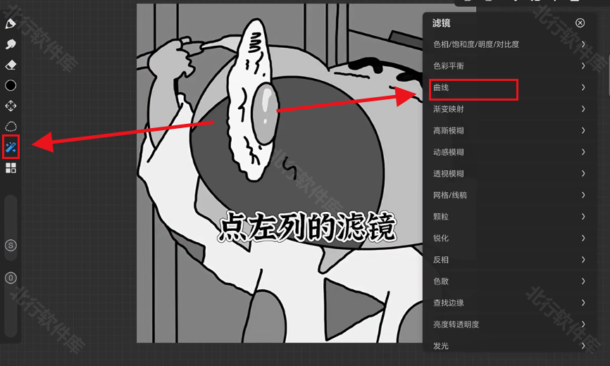 4、点击左列【滤镜】,在栏目中选择【曲线】