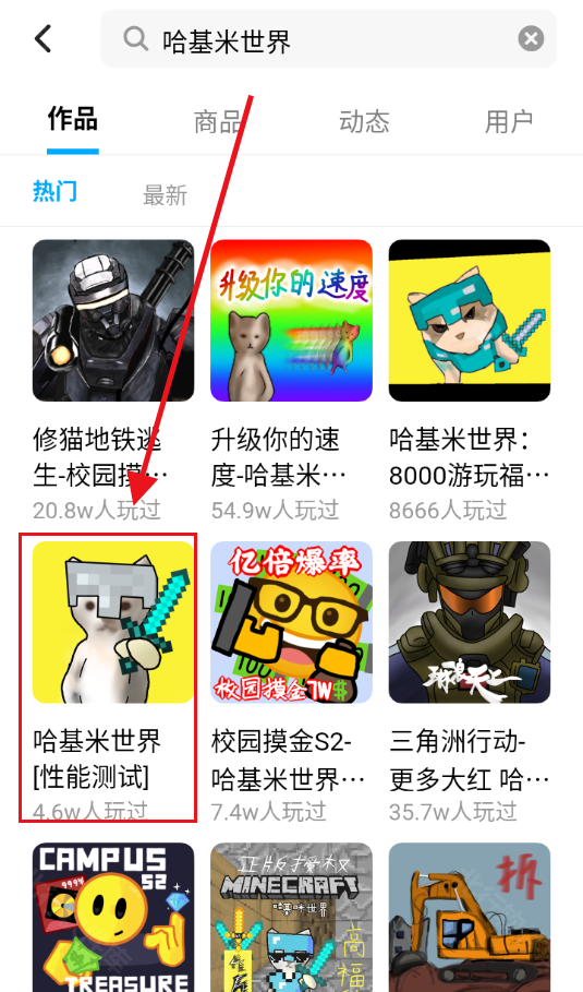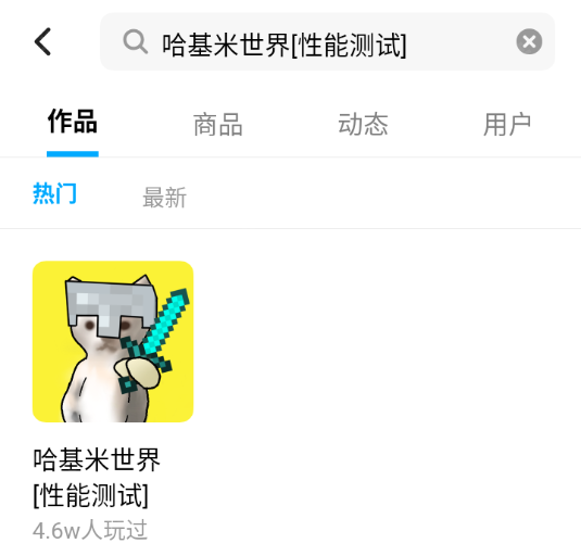 1、我们在创游世界中直接搜索“哈基米世界”,可以看到有非常多相似的搜索结果,其中“哈基米世界[性能测试]”是正版。因为本作还没做完,作者还在进行各种测试