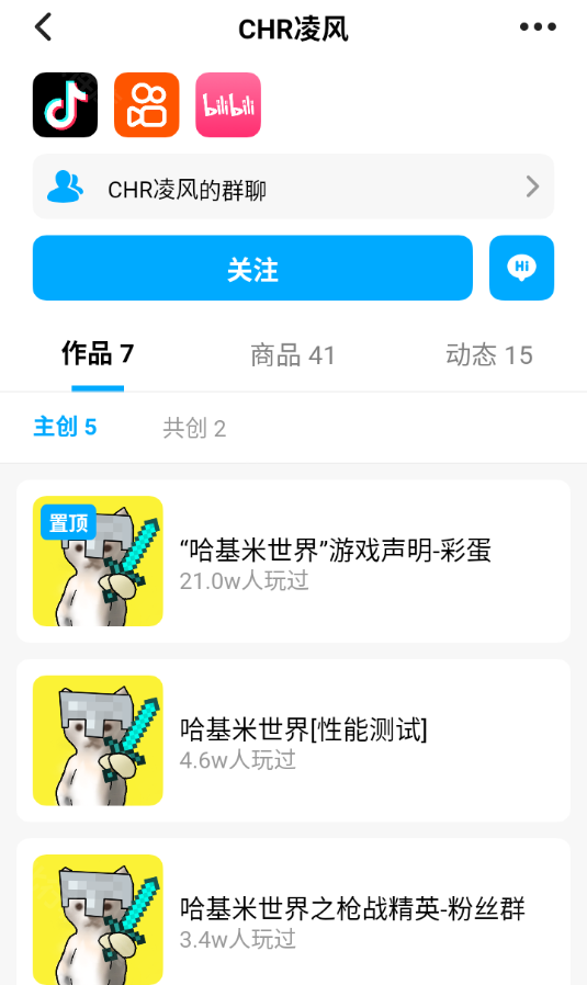 4、点击作者头像进入主页,在“作品”中就能找到原作者制作的正版哈基米世界游戏了