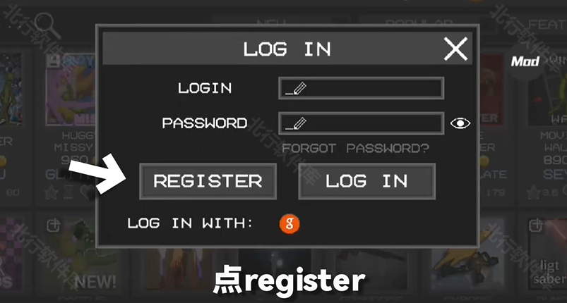 1、进入创意工坊点击右上角的LOG IN,弹出登录窗口,点击REGISTER进行注册