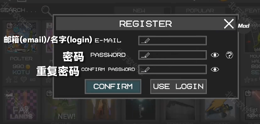 2、根据要求依次输入邮箱、密码、确认密码,然后点击USE EMAIL验证邮箱。邮箱验证完毕后,点击CONFIRM登录