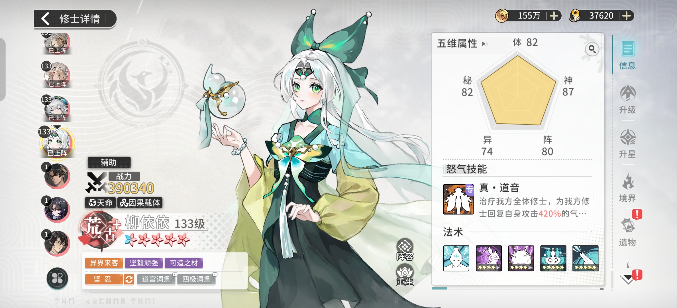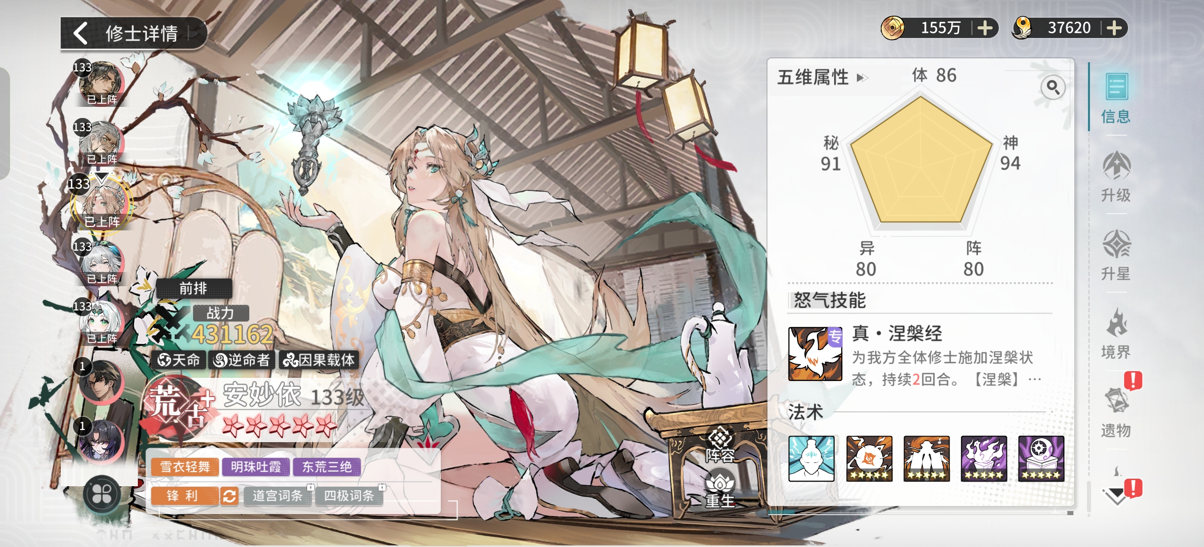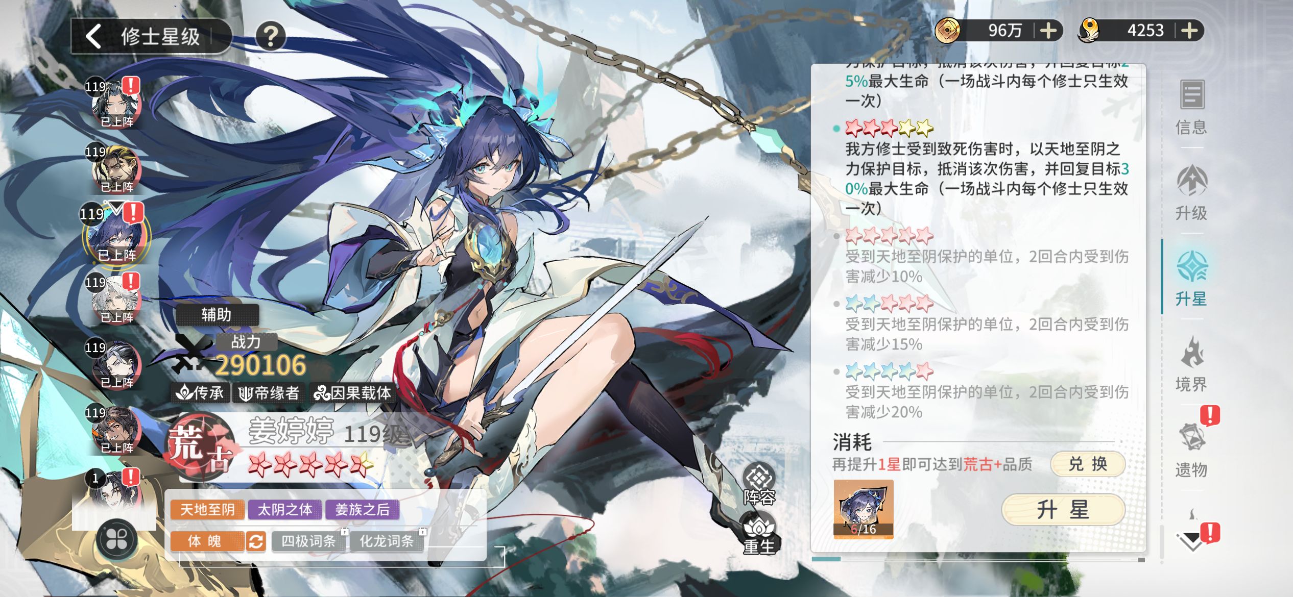天命阵容主要培养这四个角色。首先如果是主c的话,推荐圣体叶凡;然后安妙依是比较强势的辅助;柳依依是天命阵容中唯一可以给人回血的角色,算是唯一奶妈。